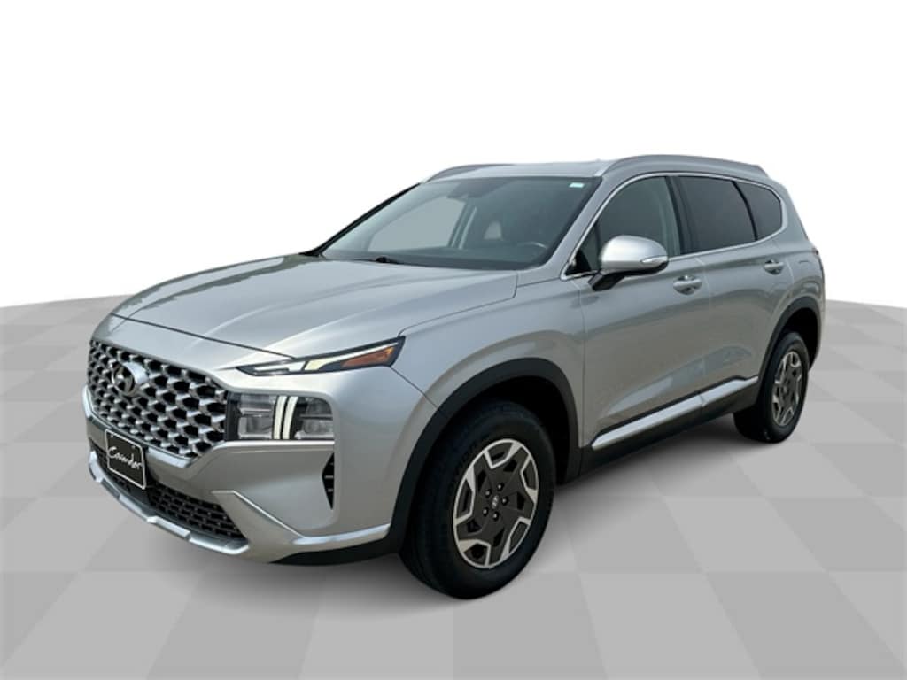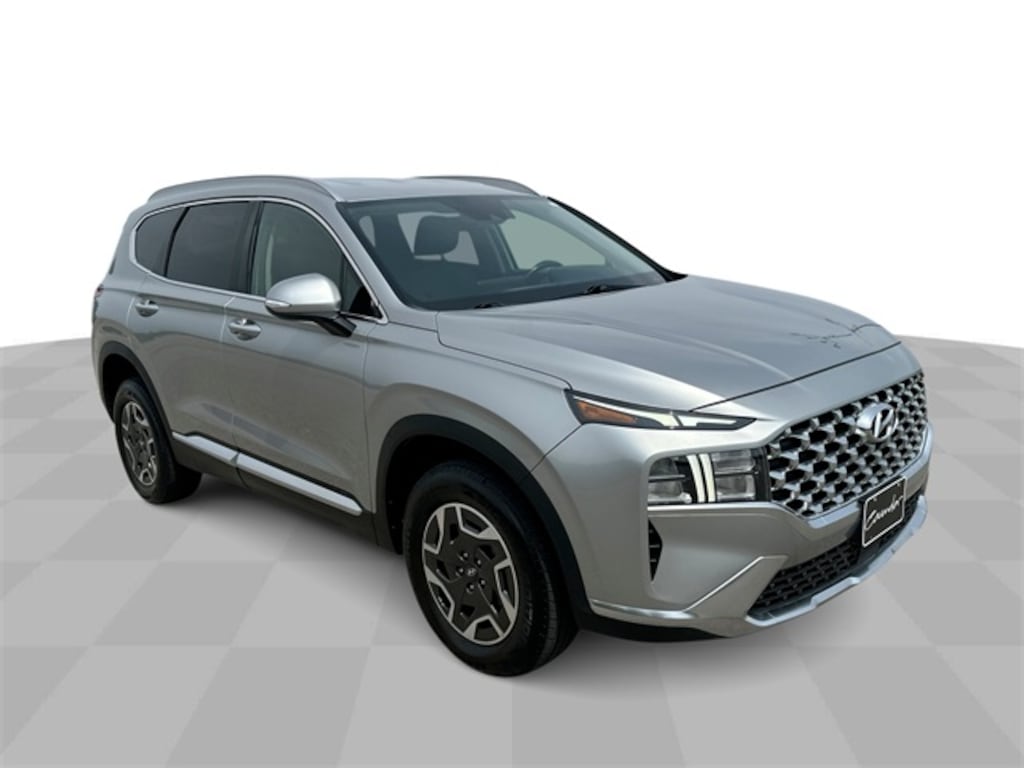 Features: , Option Group 01, Santa Fe Hybrid Blue, 4D Sport Utility, I4, AWD, Shimmering Silver, 17" x 7.0J Alloy Wheels, 3.510 Axle Ratio, 4-Wheel Disc Brakes, 6 Speakers, ABS brakes, Air Conditioning, Alloy wheels, AM/FM radio: SiriusXM, Apple CarPlay & Android Auto, Auto High-beam Headlights, Auto-dimming Rear-View mirror, Automatic temperature control, Brake assist, Bumpers: body-color, Cargo Cover/Screen, Carpeted Floor Mats, Delay-off headlights, Driver door bin, Driver vanity mirror, Dual front impact airbags, Dual front side impact airbags, Electronic Stability Control, Emergency communication system, Exterior Parking Camera Rear, Four wheel independent suspension, Front anti-roll bar, Front Bucket Seats, Front Center Armrest, Front dual zone A/C, Front reading lights, Fully automatic headlights, Garage door transmitter: HomeLink, Heated door mirrors, Heated Front Bucket Seats, Heated front seats, Illuminated entry, Leather steering wheel, Low tire pressure warning, Navigation System, Occupant sensing airbag, Outside temperature display, Overhead airbag, Overhead console, Panic alarm, Passenger door bin, Passenger vanity mirror, Power door mirrors, Power driver seat, Power Liftgate, Power steering, Power windows, Radio: AM/FM Display Audio, Rear anti-roll bar, Rear seat center armrest, Rear window defroster, Rear window wiper, Remote keyless entry, Security system, Speed control, Speed-sensing steering, Split folding rear seat, Spoiler, Stain-Resistant Cloth Seat Trim, Steering wheel mounted audio controls, Tachometer, Telescoping steering wheel, Tilt steering wheel, Traction control, Trip computer, Turn signal indicator mirrors, and Variably intermittent wipers.